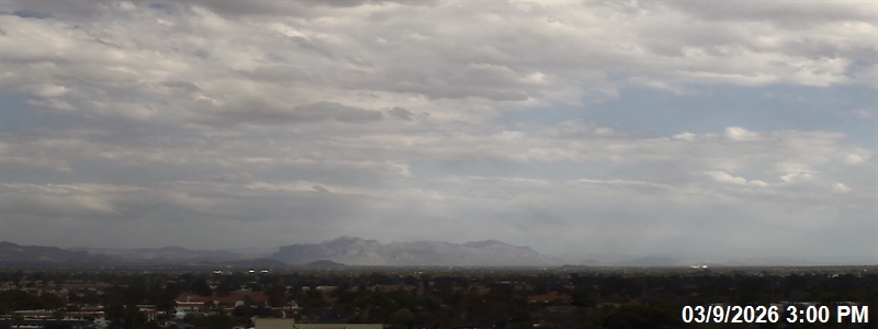 The view is looking east from downtown Mesa with the community of Apache Junction between the camera and the mountain vista.