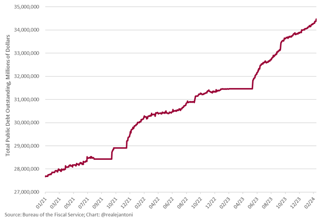 Currently, total US debt stands at a record $34.5 trillion, up $11.2 TRILLION since 2020.